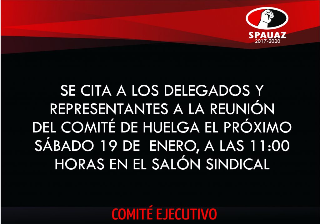SE CITA A LOS DELEGADOS Y REPRESENTANTES A LA REUNIÓN DEL COMITÉ DE HUELGA EL PRÓXIMO SÁBADO 19 DE ENERO, A LAS 11:00 HORAS EN EL SALÓN SINDICAL.
